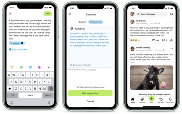 AI is already an integral part of the product experiences at Nextdoor, from features like Notifications and Newsfeed to applications leveraging cutting-edge generative AI technology. Assistant can be used when writing a new post to see a revised suggestion that the neighbour can review and edit before finishing their post. By analysing the topic and context of conversations, Nextdoor can better match content to the needs and interests of neighbours, providing more targeted recommendations for local news, events, and activities. Additionally, Assistant will suggest ways to rephrase potentially harmful comments to make the same point in a more neighbourly way. This application of generative AI to encourage kindness accelerates Nextdoor’s ongoing efforts to build an inclusive, welcoming community for all.